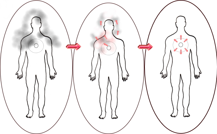 右下の図は、最終的に、身体とオーラに現れていた感情による雲のようなエネルギーが消え去った状態を表しています。